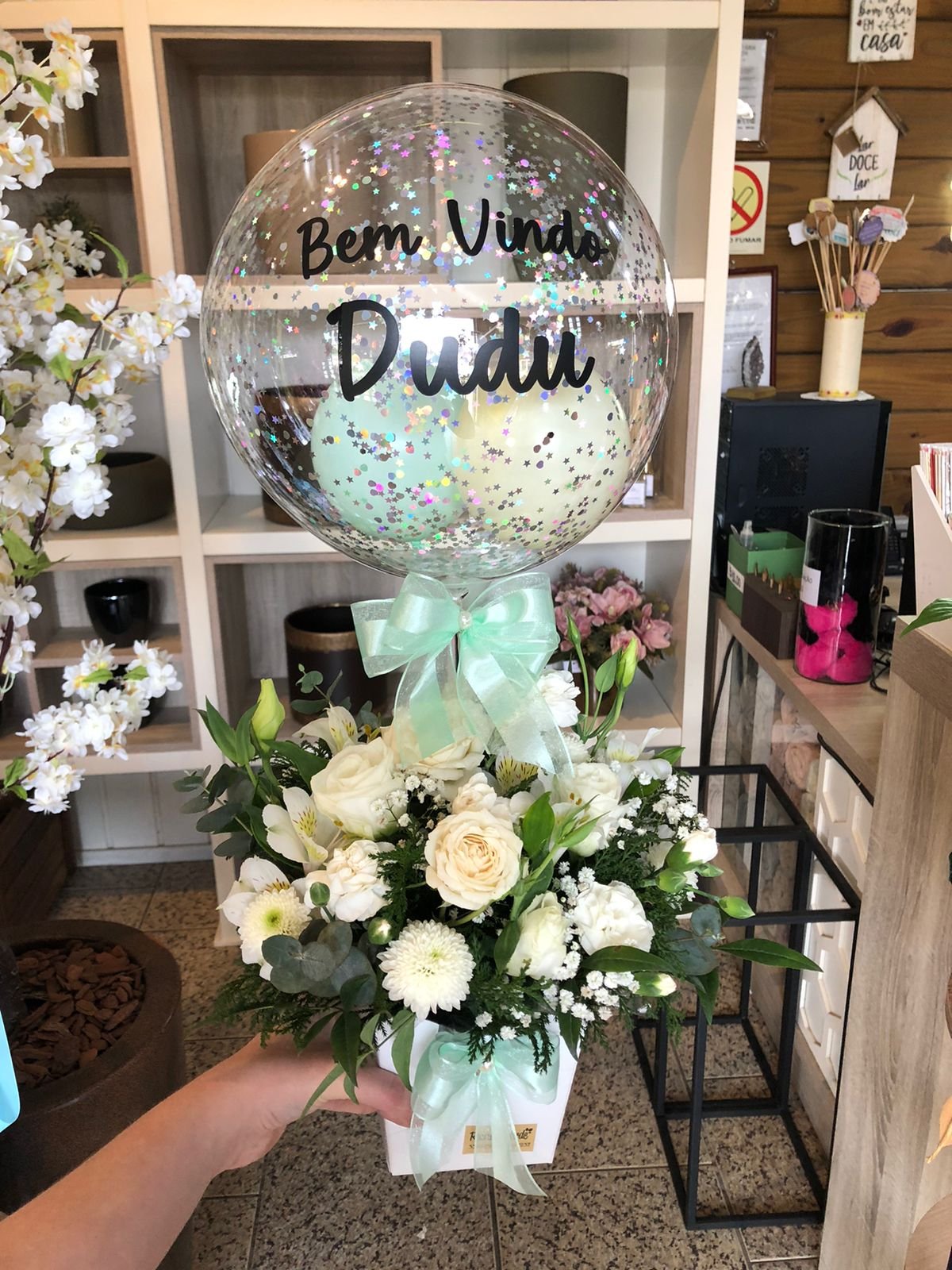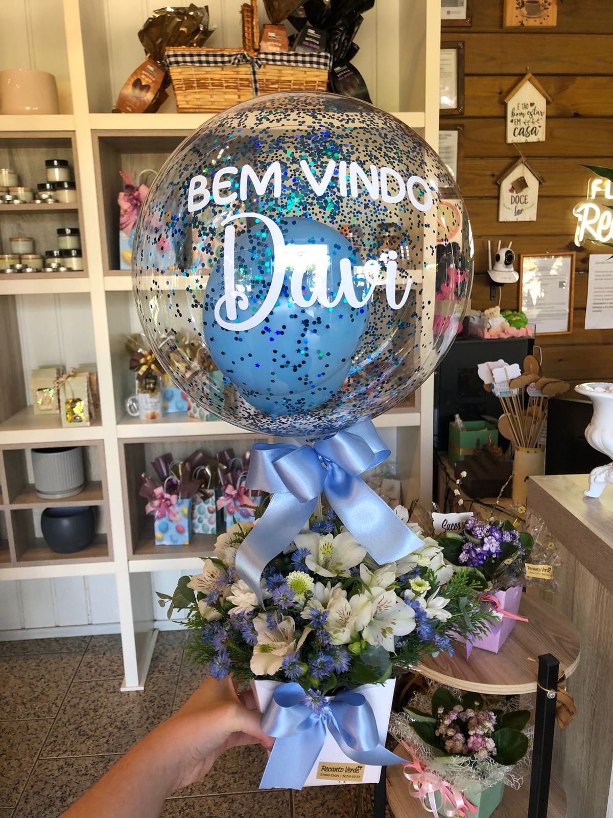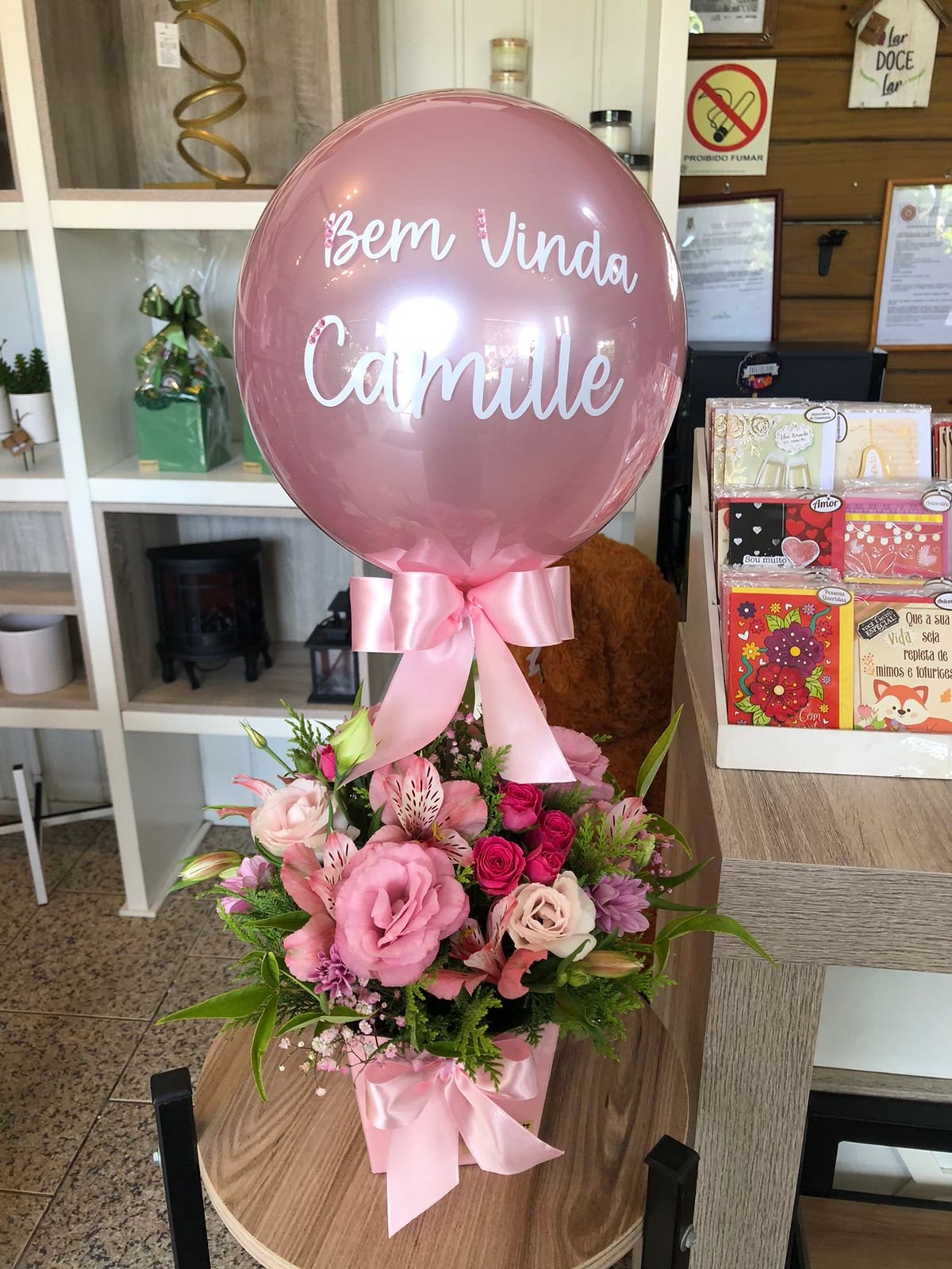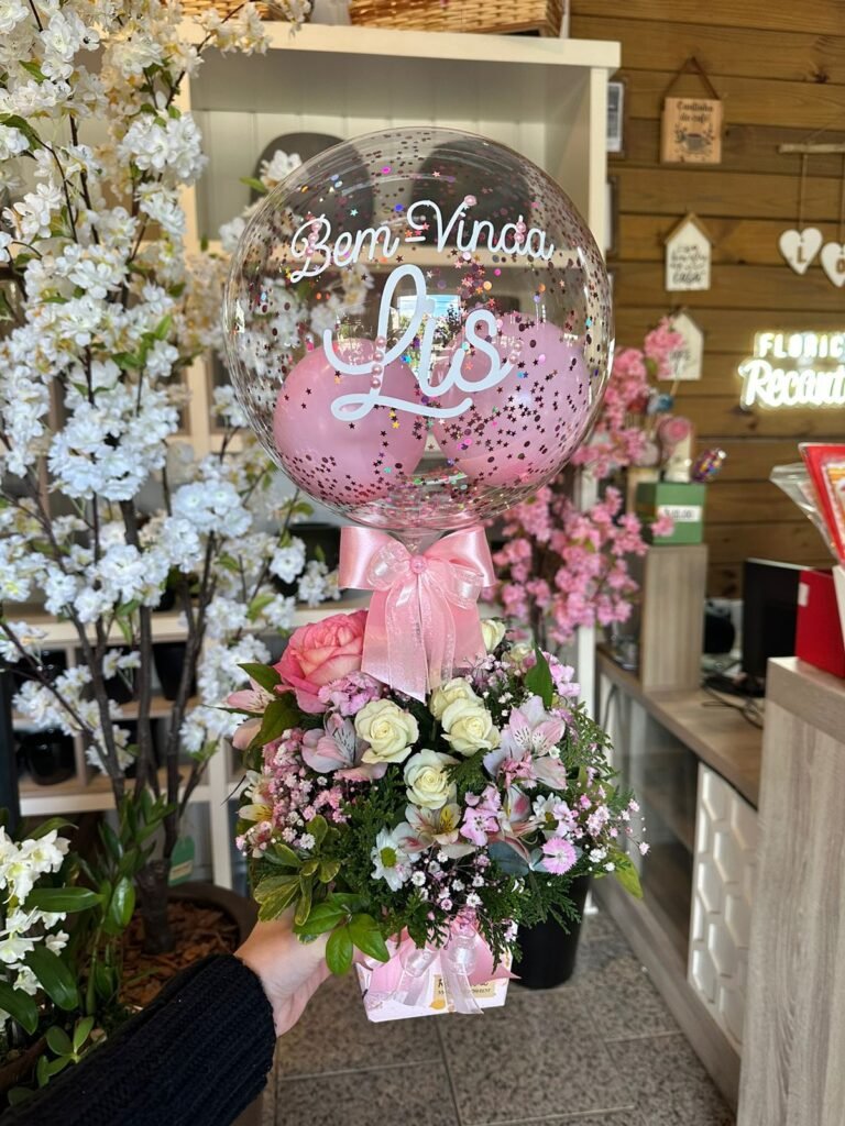 Arranjo de flores naturais com Bolha P personalizada.