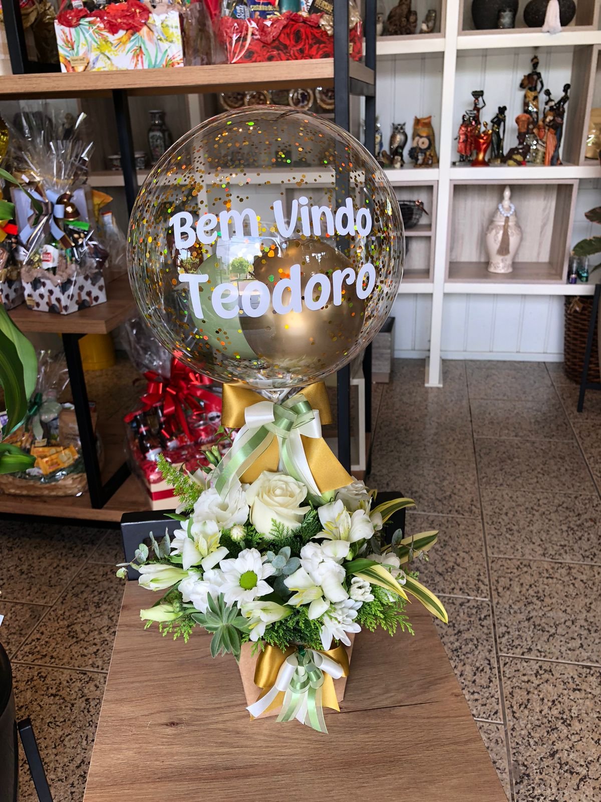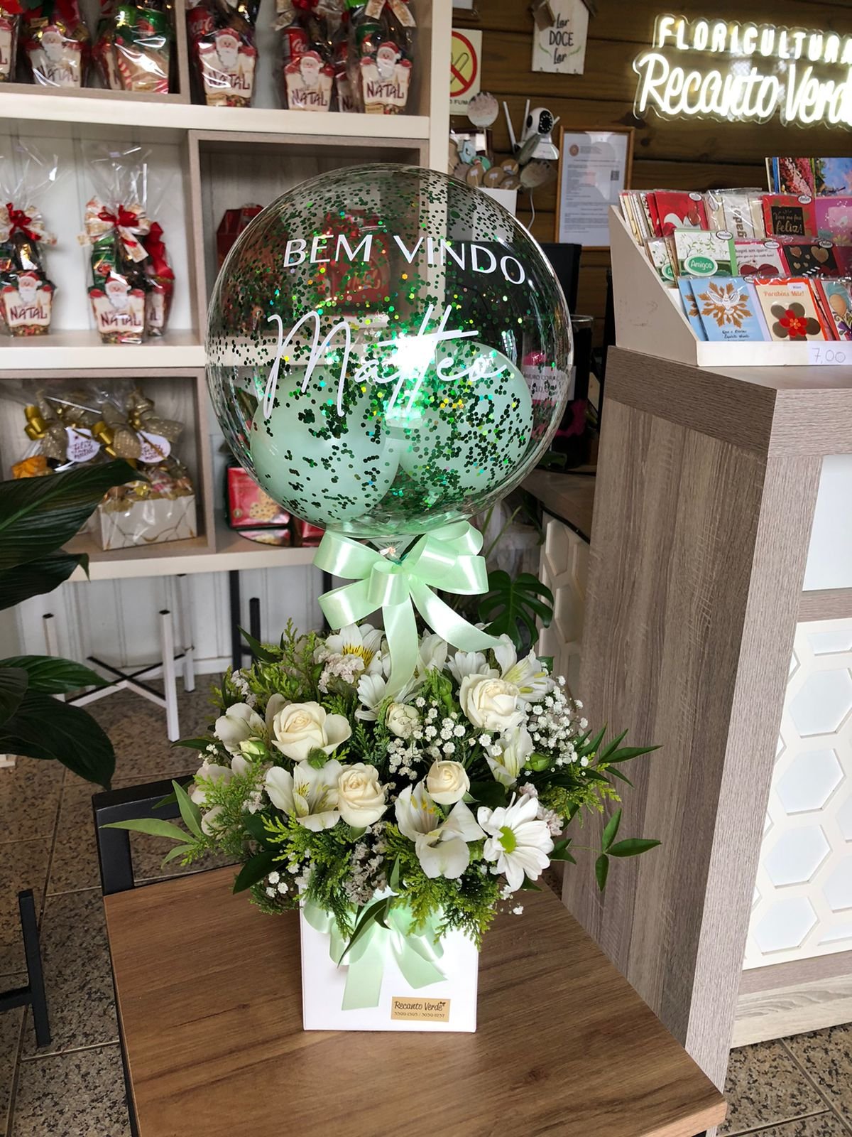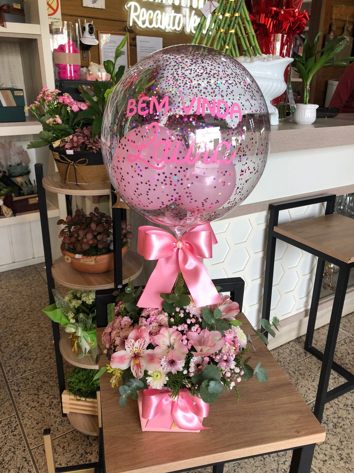 Arranjo de flores naturais com Bolha P personalizada.