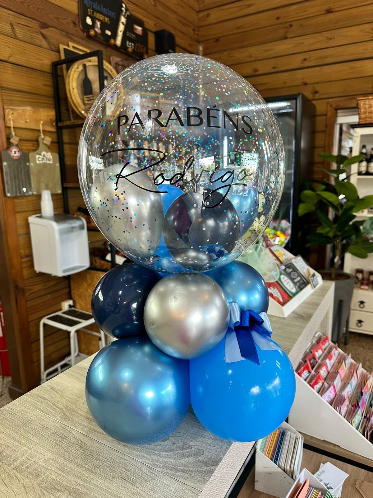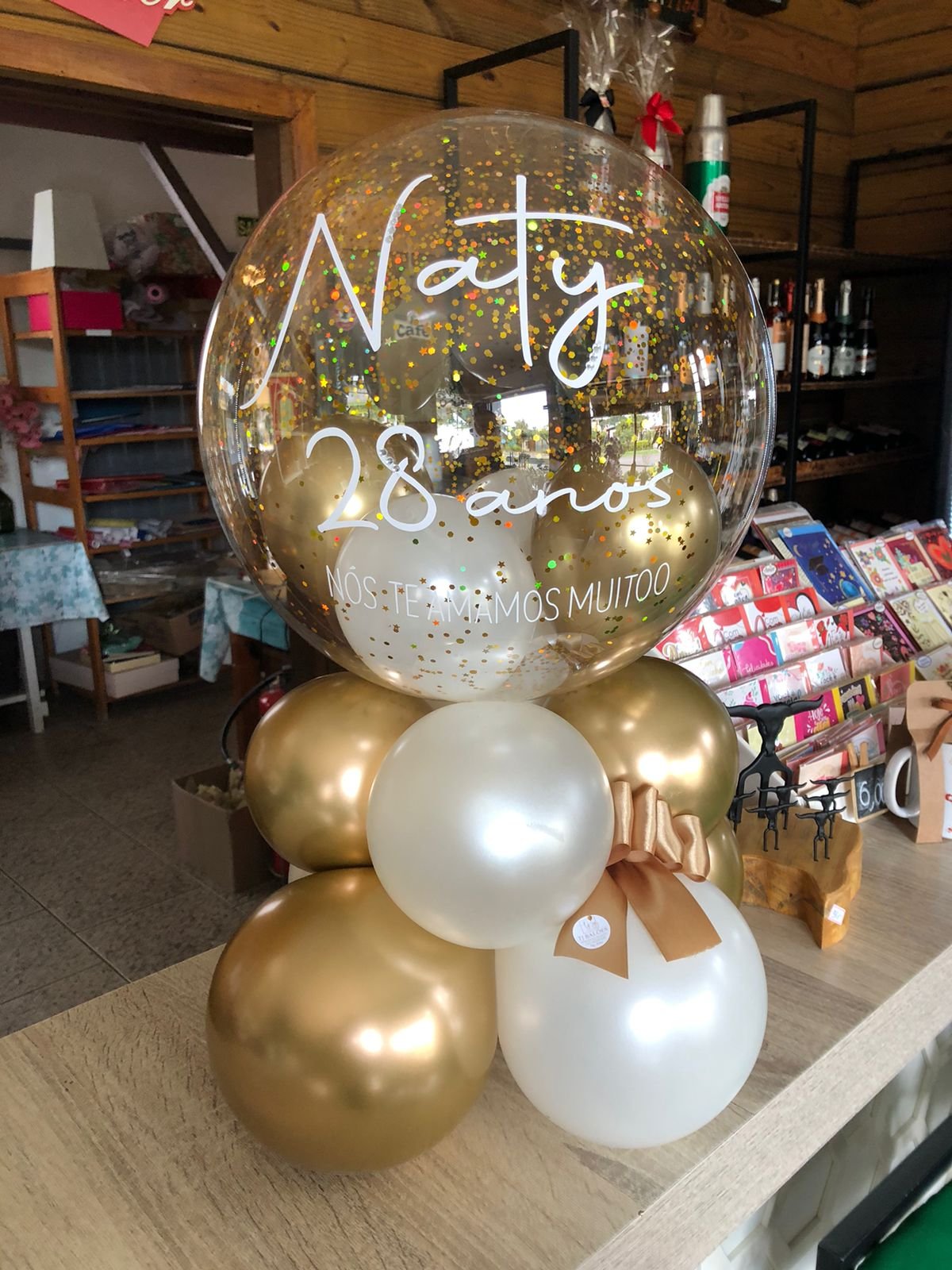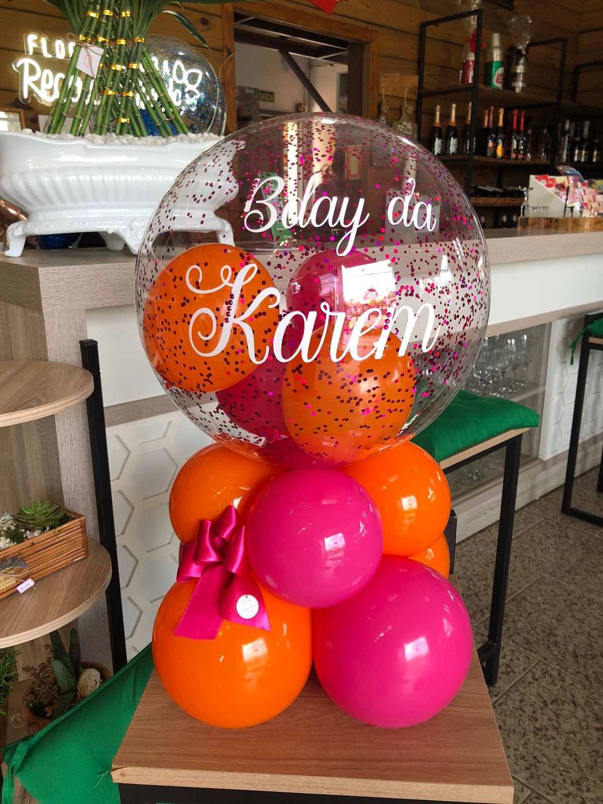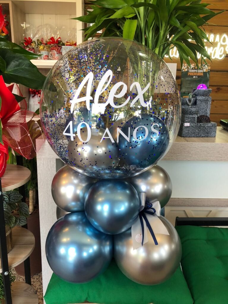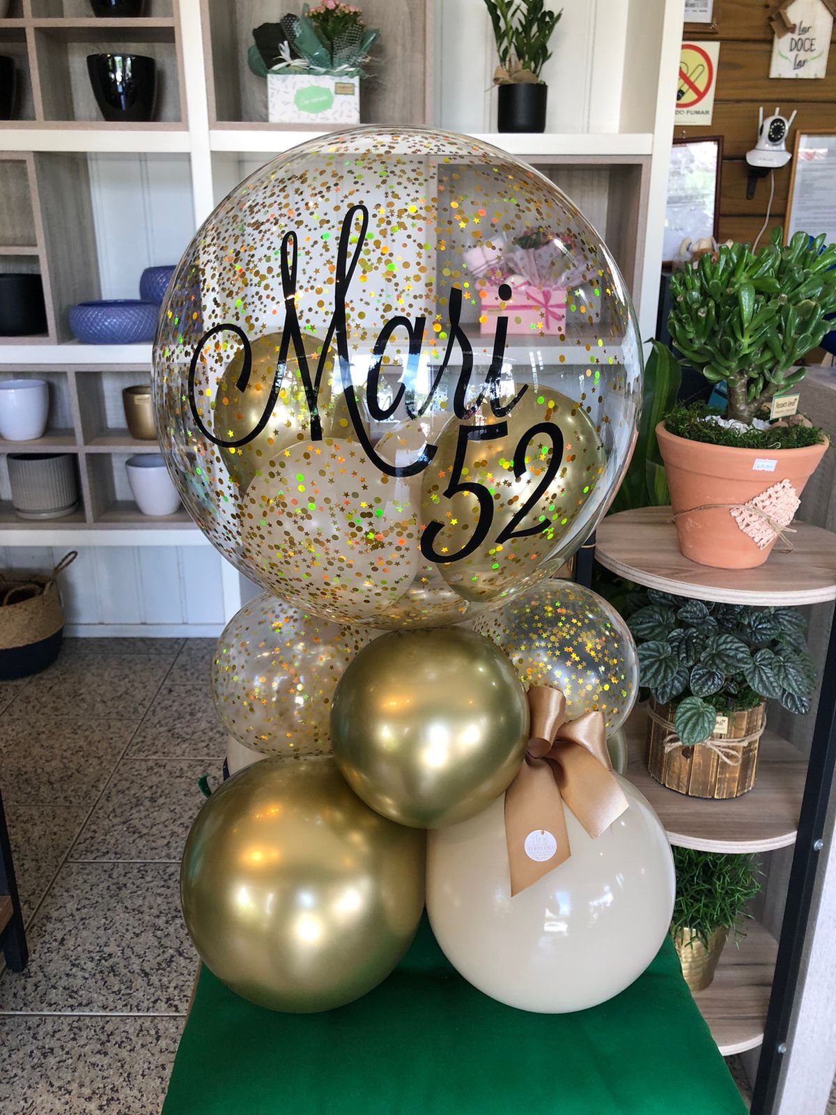 Balão bolha M com balões internos e confetes, escrita personalizada + base de balões simples para suporte.