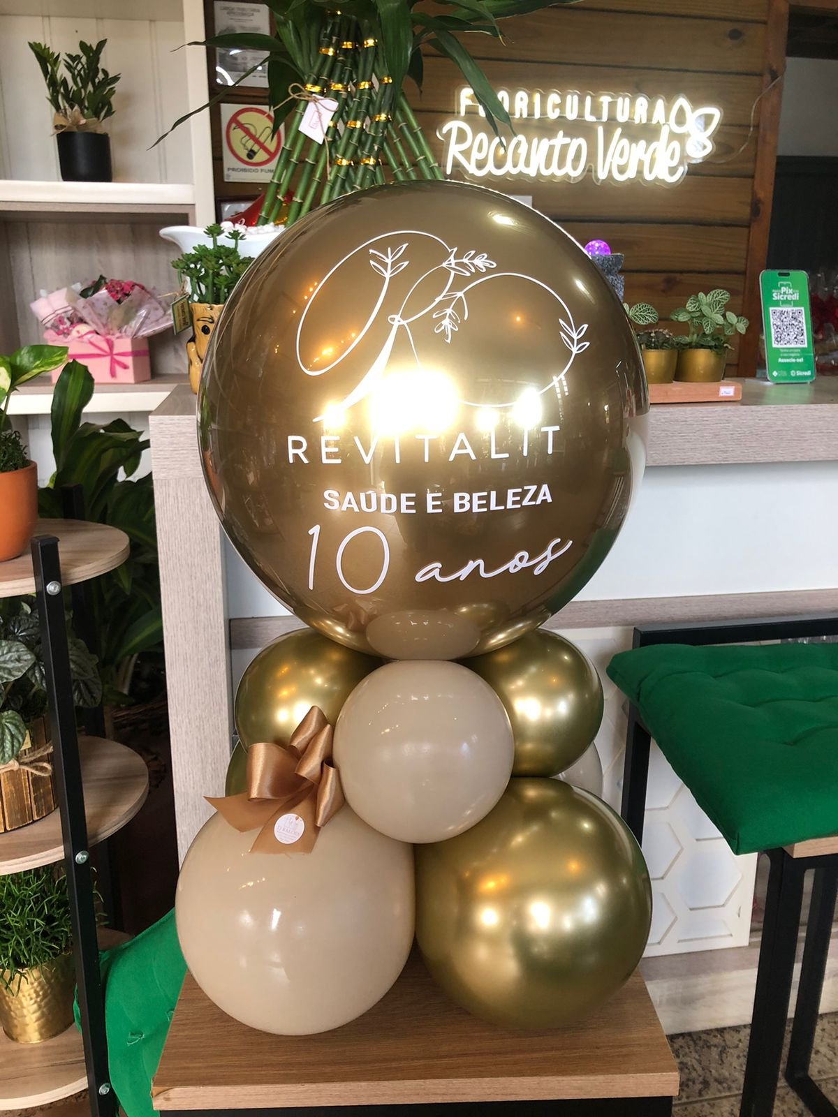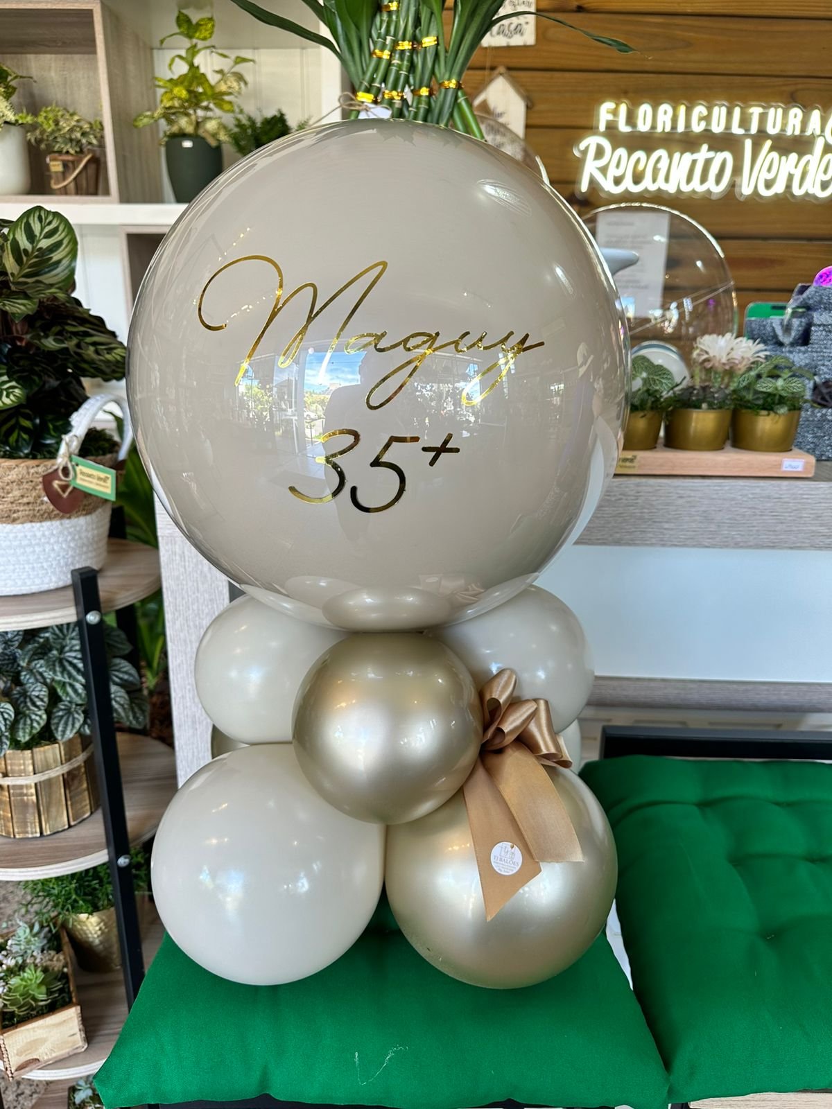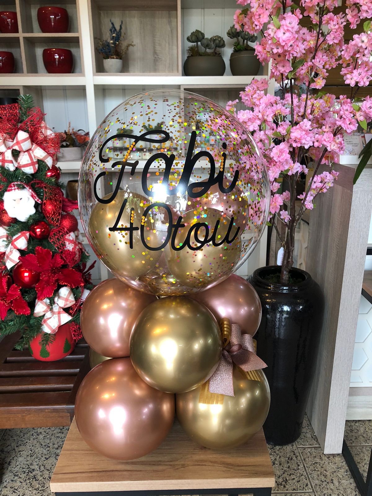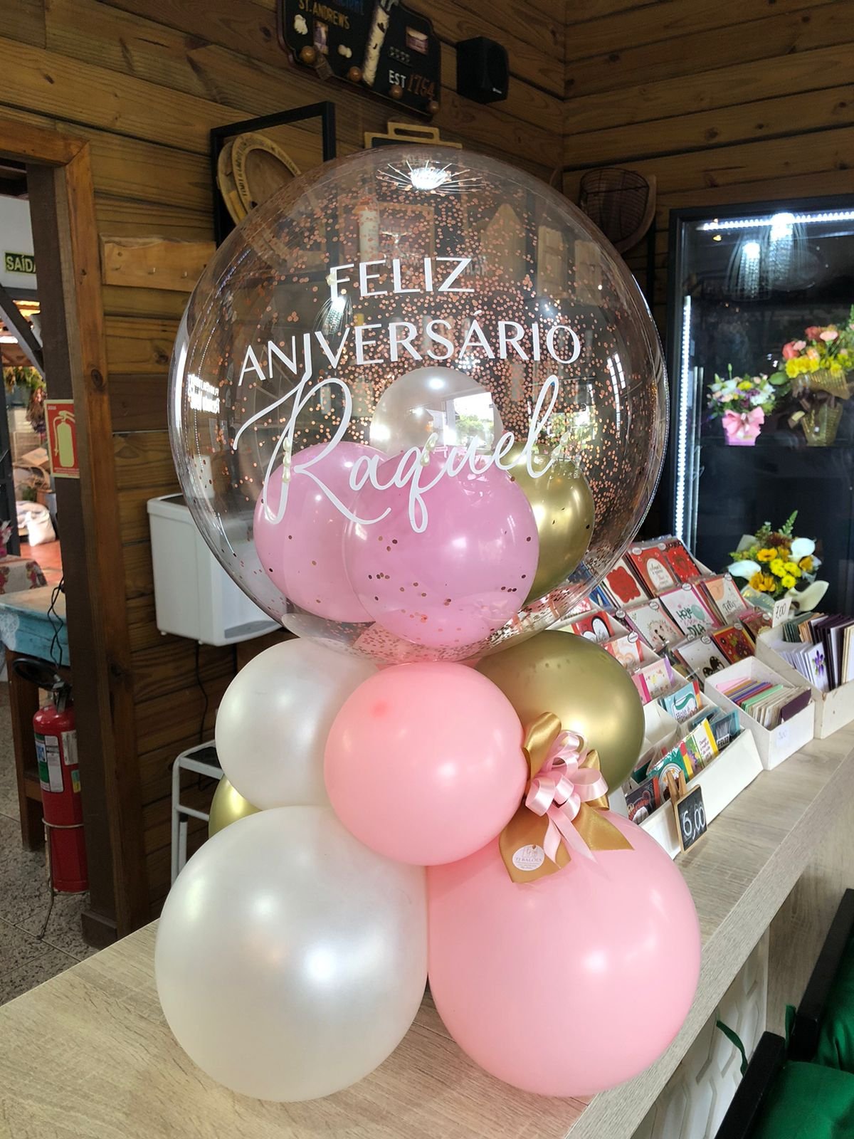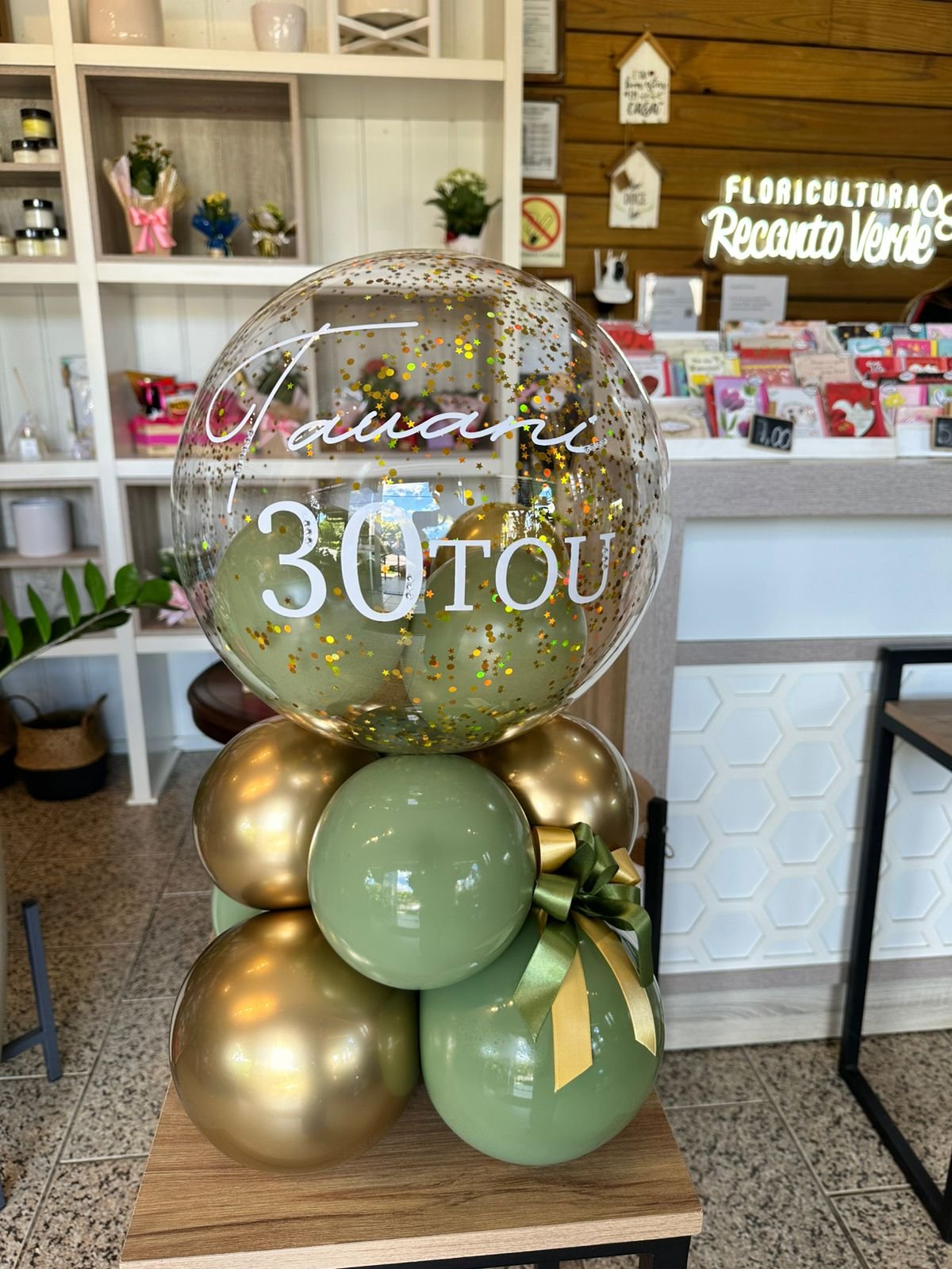 Balão bolha M com balões internos e confetes, escrita personalizada + base de balões simples para suporte.