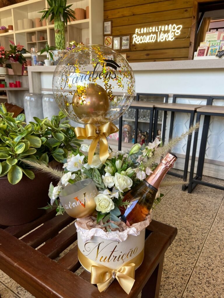 Caixa box redonda branca personalizada com mix de flores naturais + balão bolha P personalizada + espumante + taça gin personalizada