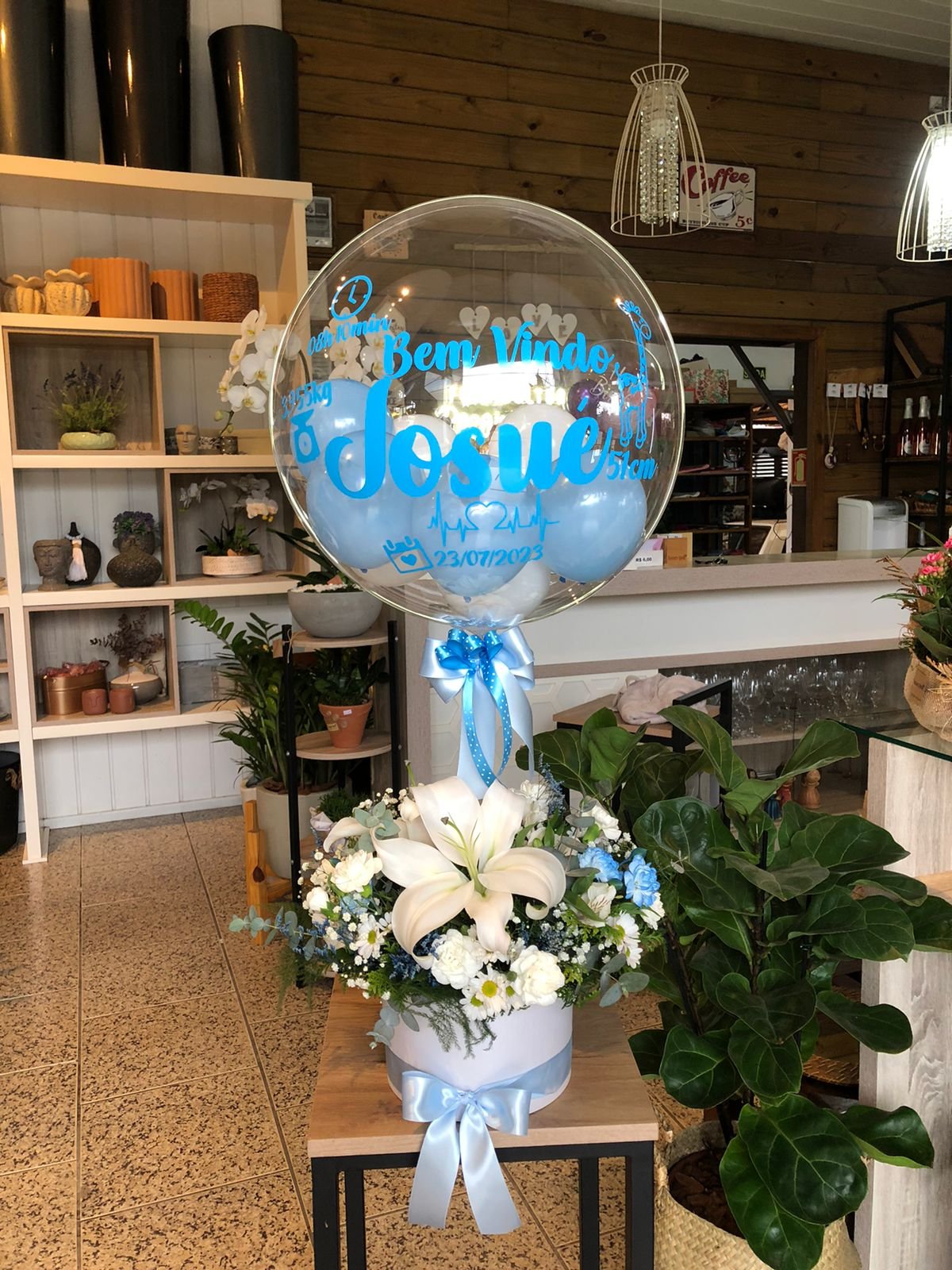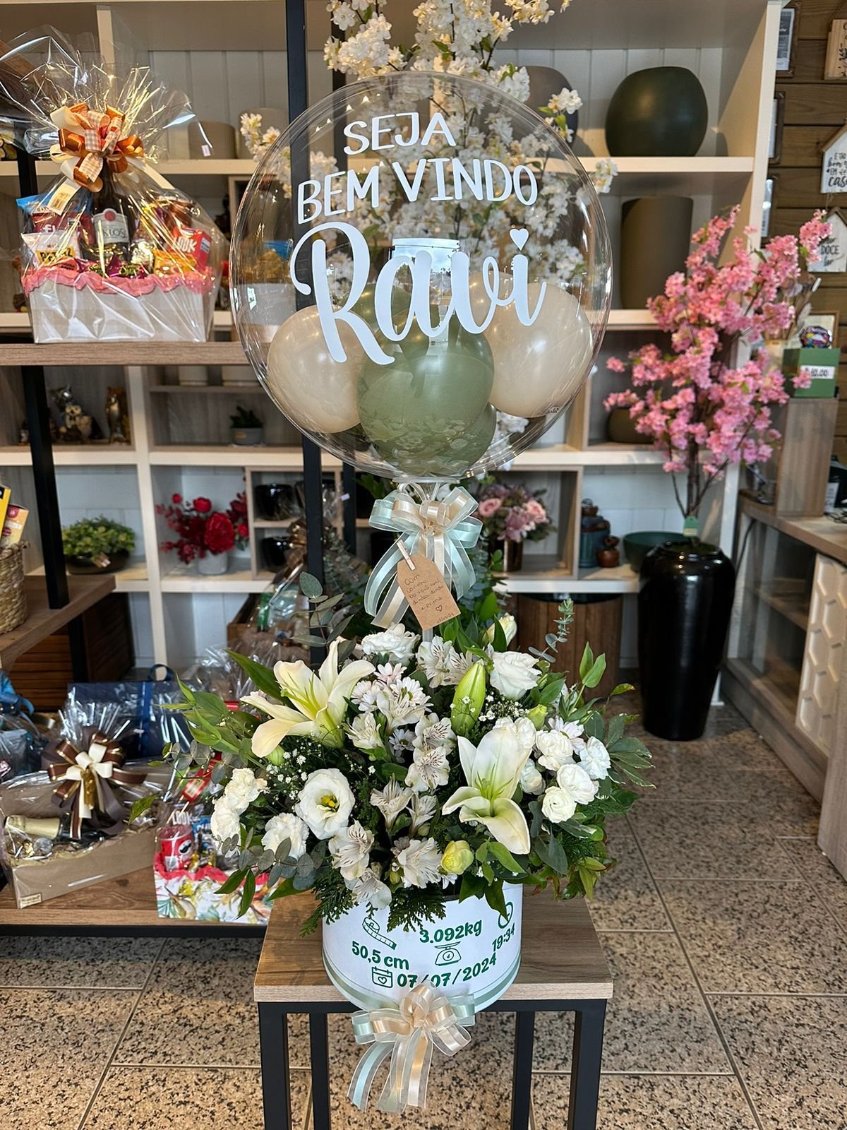 Arranjo de flores naturais em caixa bom redonda + balão bolha G personalizada