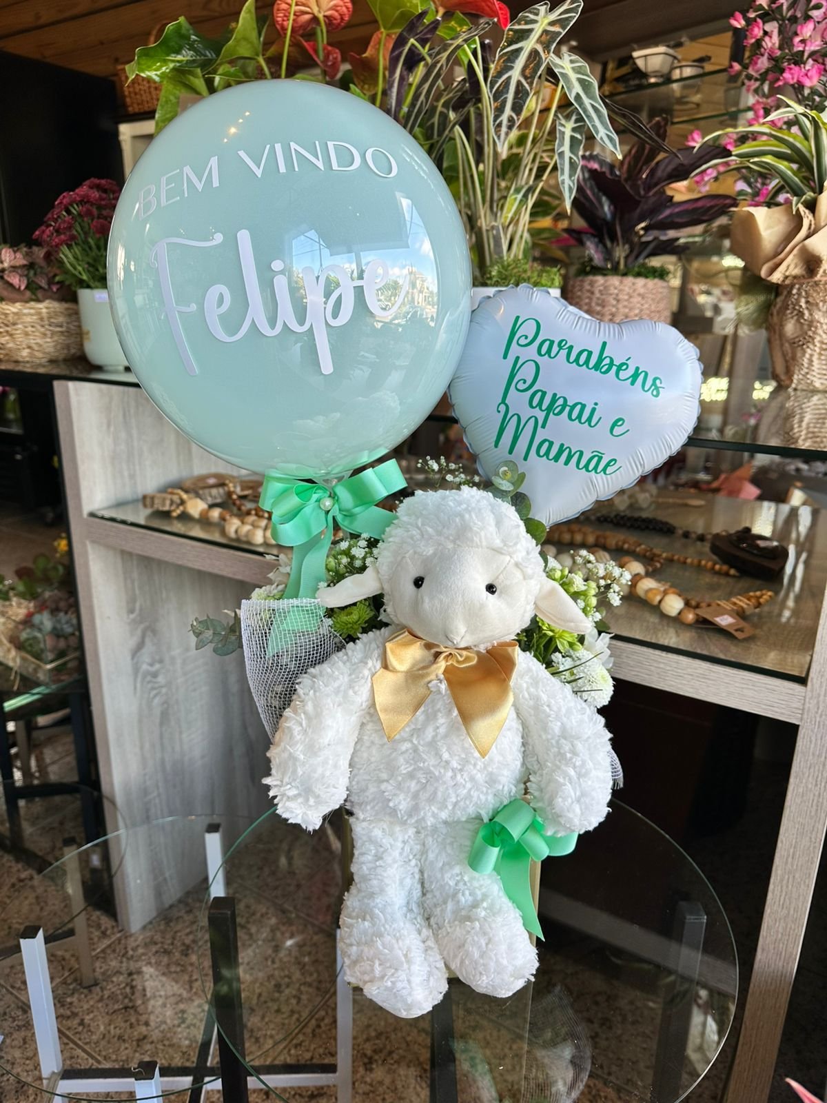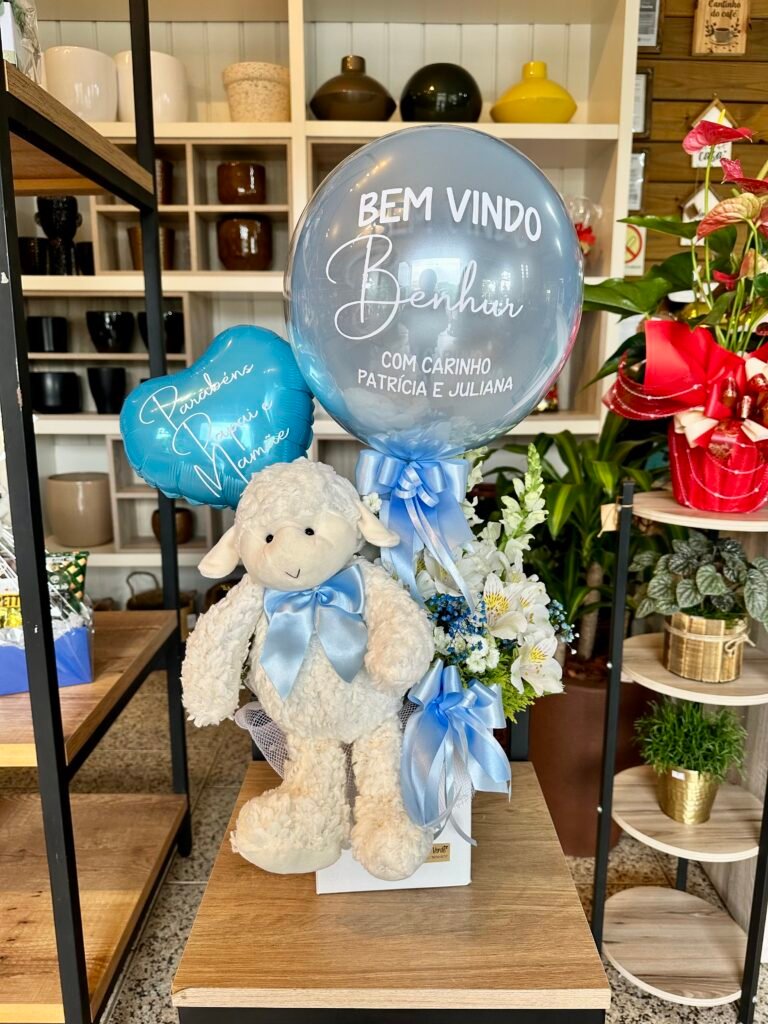 Box maternidade com arranjo de flores naturais, ovelinha, balão bolha P personalizada e coração 20cm personalizado.