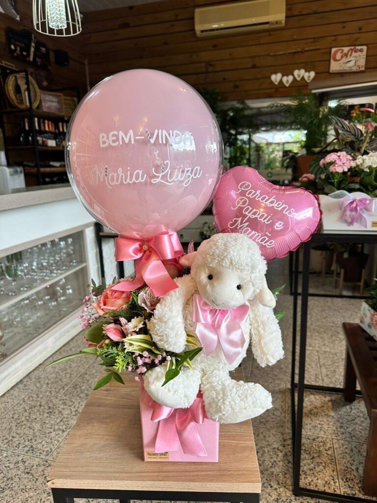 Box maternidade com arranjo de flores naturais, ovelinha, balão bolha P personalizada e coração 20cm personalizado.