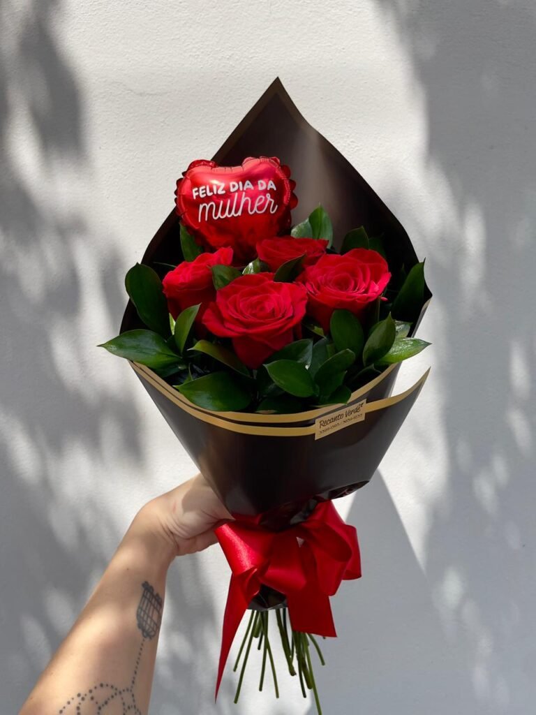 Buquê ao estilo moderno com 4 rosas vermelhas + balão 15cm