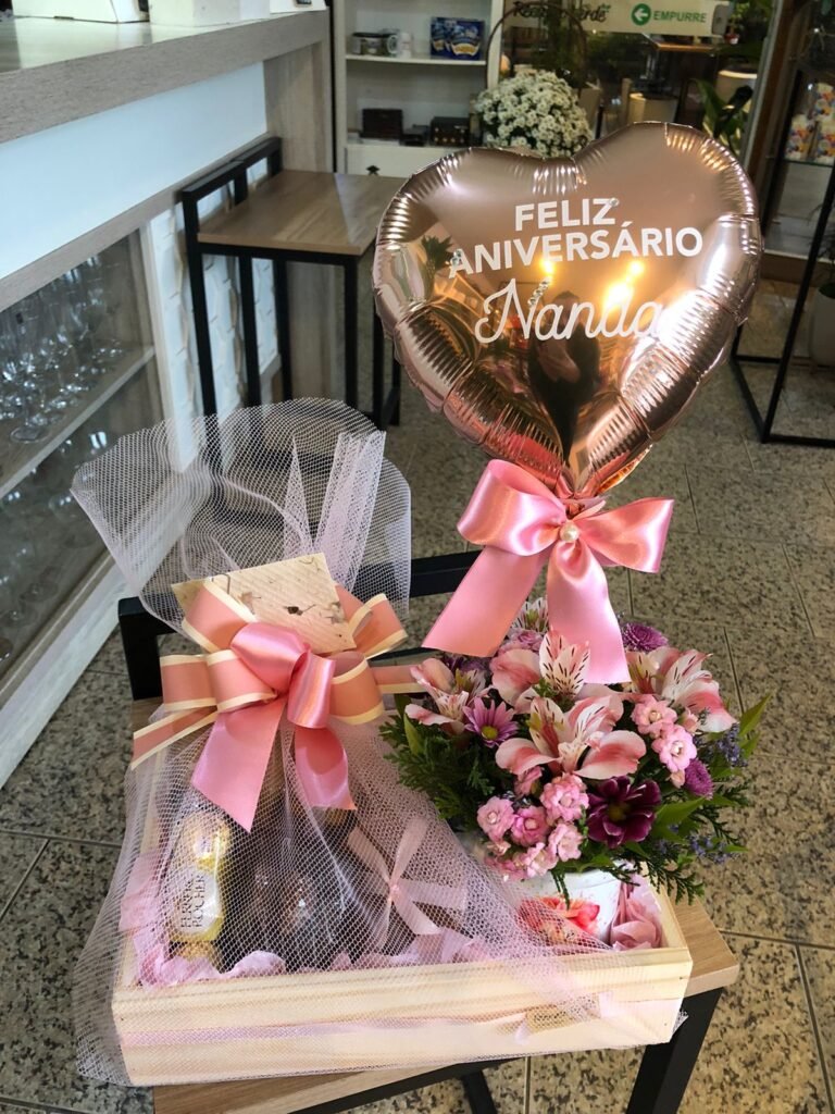 Cesta ao estilo café da manhã com bolinho, mix de pastéis, Ferrero Rocher, sachet de café + caneca personalizada com mix de flores naturais + balão 20cm personalizado. Embalagem da cesta com tule delicado para dar aquele toque especial