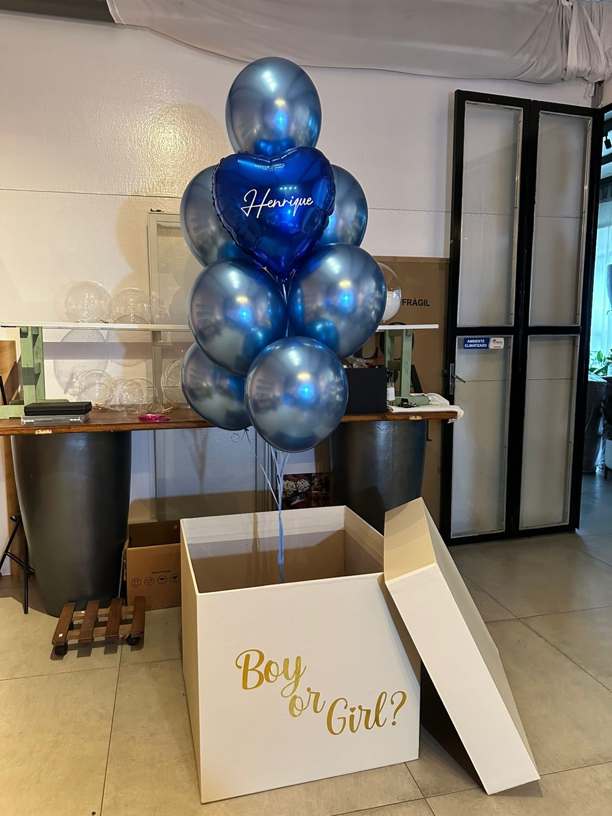 Aluguel de Caixa Revelação 60cmX60cm na cor bege com escrita em dourado “Boy or Girl?” (não é possível tirar a escrita, ela é fixa) com composição de balões em gás hélio com 8 látex importados + 1 coração personalizado (Buque de balões fixos na caixa)