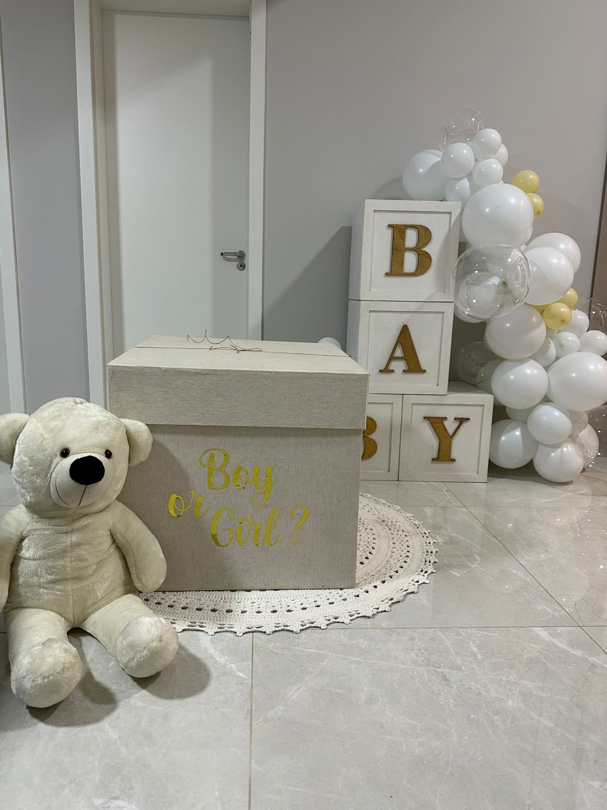 Aluguel de Caixa Revelação 60cmX60cm na cor bege com escrita em dourado “Boy or Girl?” (não é possível tirar a escrita, ela é fixa) com composição de balões em gás hélio com 8 látex importados + 1 coração personalizado.