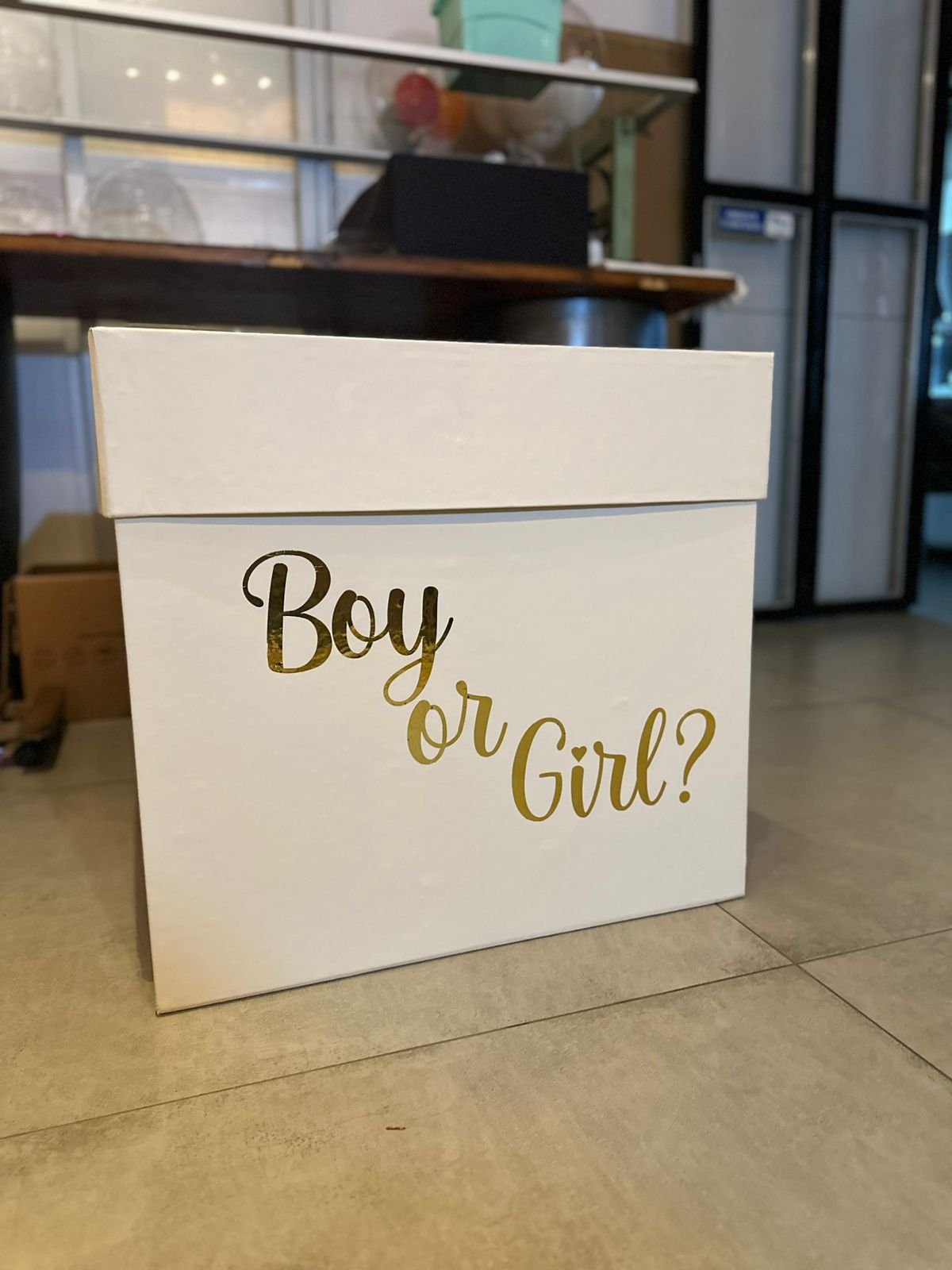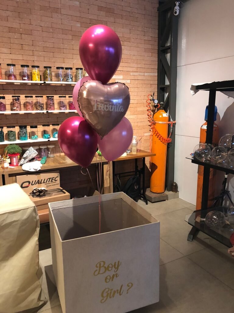 Aluguel de Caixa Revelação 60cmX60cm na cor bege com escrita em dourado “Boy or Girl?” (não é possível tirar a escrita, ela é fixa)  com composição de balões em gás hélio com 4 látex importados + 1 coração personalizado (Buque de balões fixos na caixa)